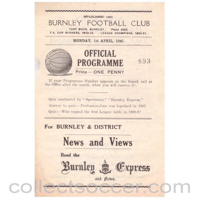 Burnley v Stoke Football Programme in great condition for the match played on the 1st April 1946.