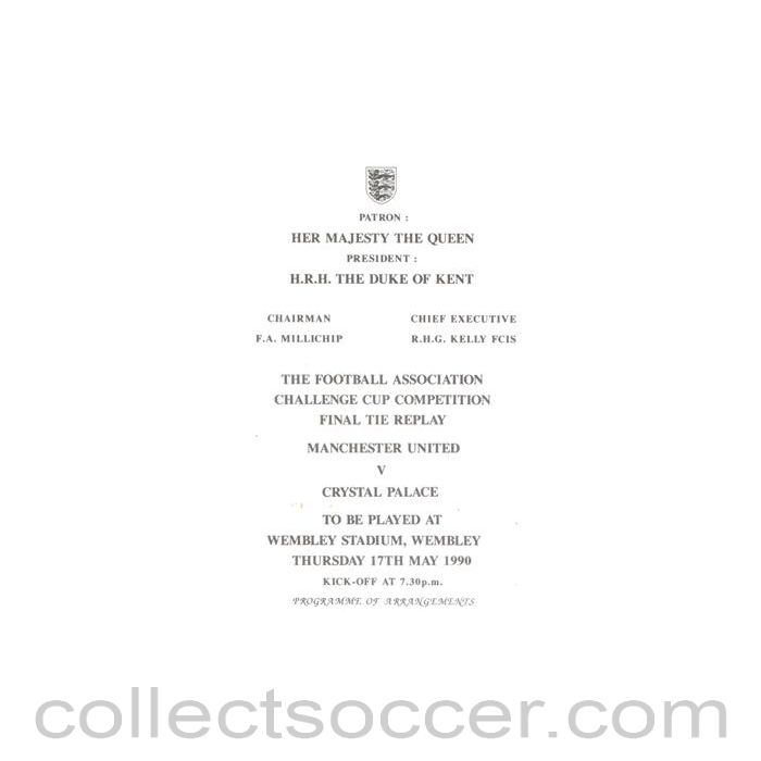 1990 League Cup Final Replay Royal Box Programme of Arrangements Manchester United v Crystal Palace 17/05/1990 at Wembley, 8 pages, in very good condition.
