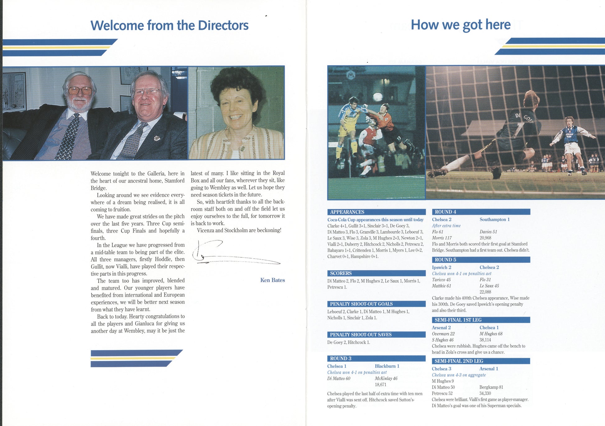 Very rare menu only available to players, sponsors and staff who attended the celebration Banquet after Chelsea's victory in the Coca Cola Cup against Middlesbrough at Wembley Stadium. 20 full colour glossy pages and this is the last one that we have in stock.