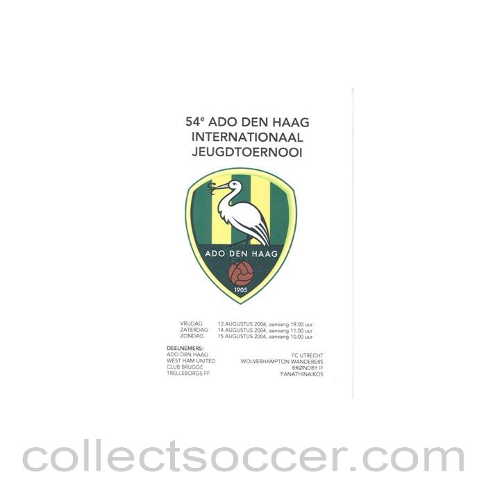 ADO Den Haag Youth Tournament August 2004 official programme, 16 pages, in mint condition. Some of the participating teams are: ADO Den Haag, West Ham United, Club Brugge, Trelleborgs, Utrecht, Wolverhampton Wanderers, Brondby and Panathinaikos.