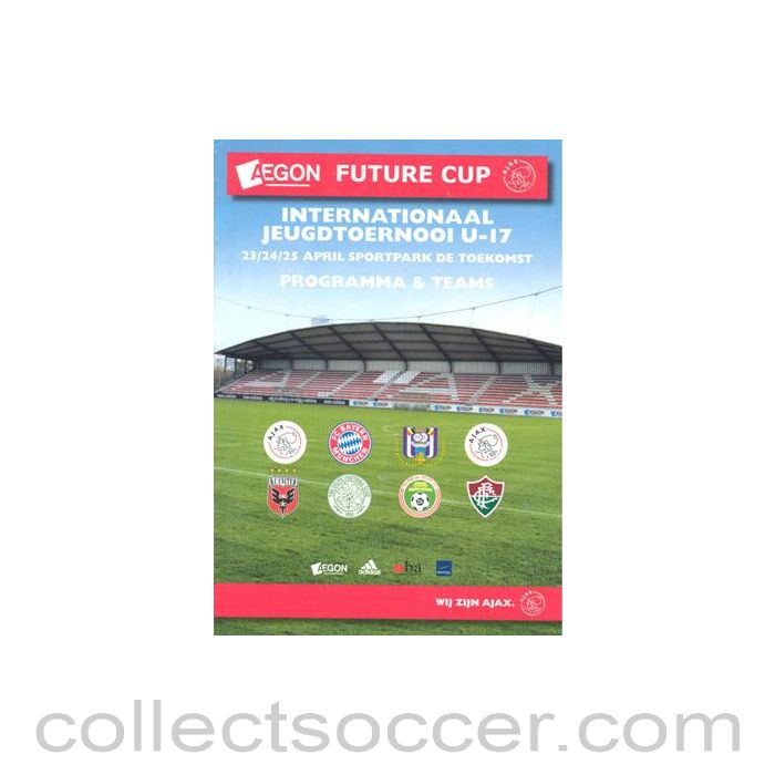 AEGON Future Cup U17 Youth Tournament April 2011 official programme, 12 pages, in mint condition. Some of the participating teams are: Ajax, Fluminense, Celtic, Ajax Cape Town, Bayern Munich, China U17, Anderlecht and DC United.