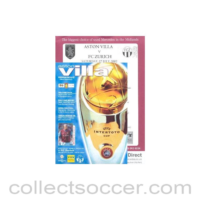 Aston Villa v Zurich official programme 27/07/2002 Intertoto Cup, with a teamsheet, 16 pages, in mint condition.
