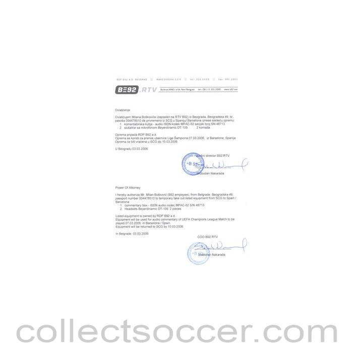 B92 Belgrade radio, television and internet broadcaster's Pwer Of Attorney of a broadcaster to bring temporarily equipment for audio commentary of the Champions League match on 07/03/2006 in Barcelona.