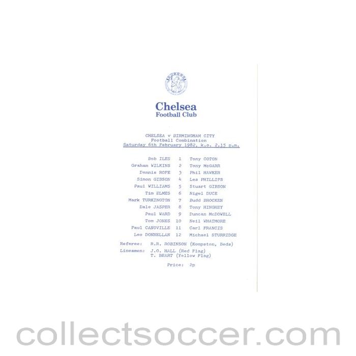 Chelsea v Birmingham City Reserves official programme 06/02/1982 Football Combination, one page, in mint condition.