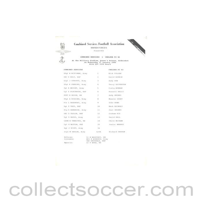 Combined Services v Chelsea XI official teamsheet 11/01/1995 in very good condition.