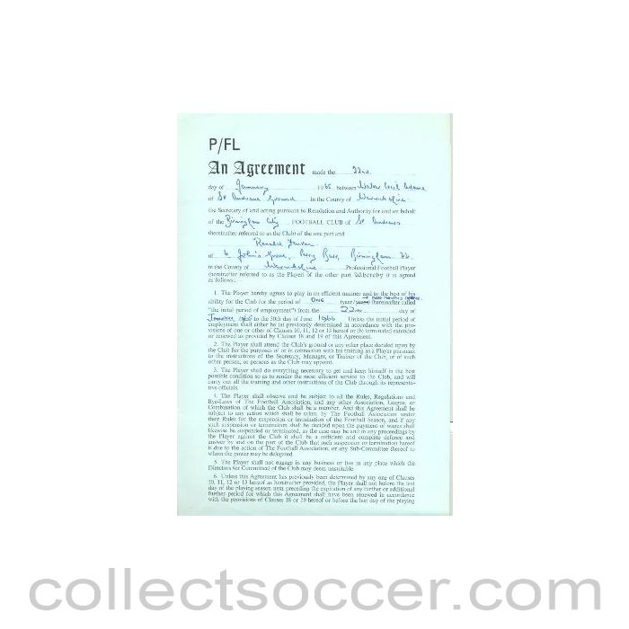 Contract For Hire of a Player between Birmingham City F.C. and Ronald Fenton of 22/01/1965 in very good condition.