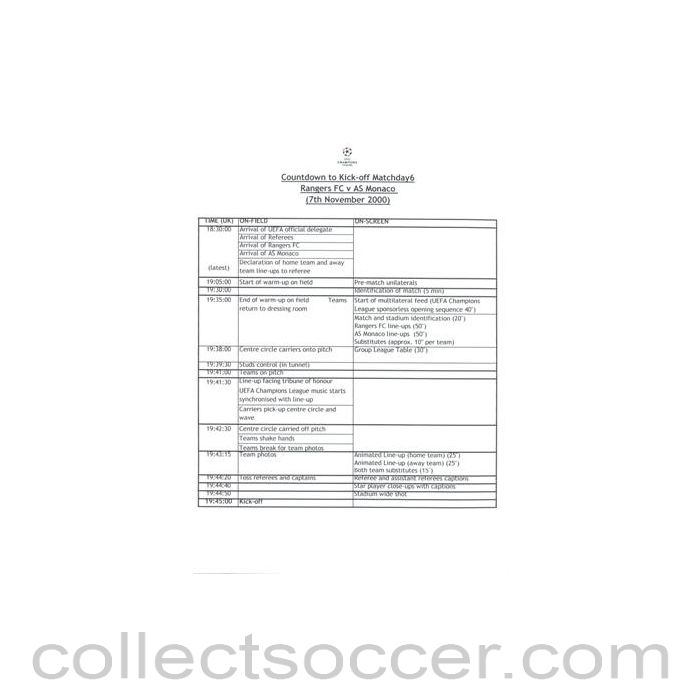 Glasgow Rangers v Monaco 07/11/2000 Countdown to Kick-off, 1 page, in mint condition.