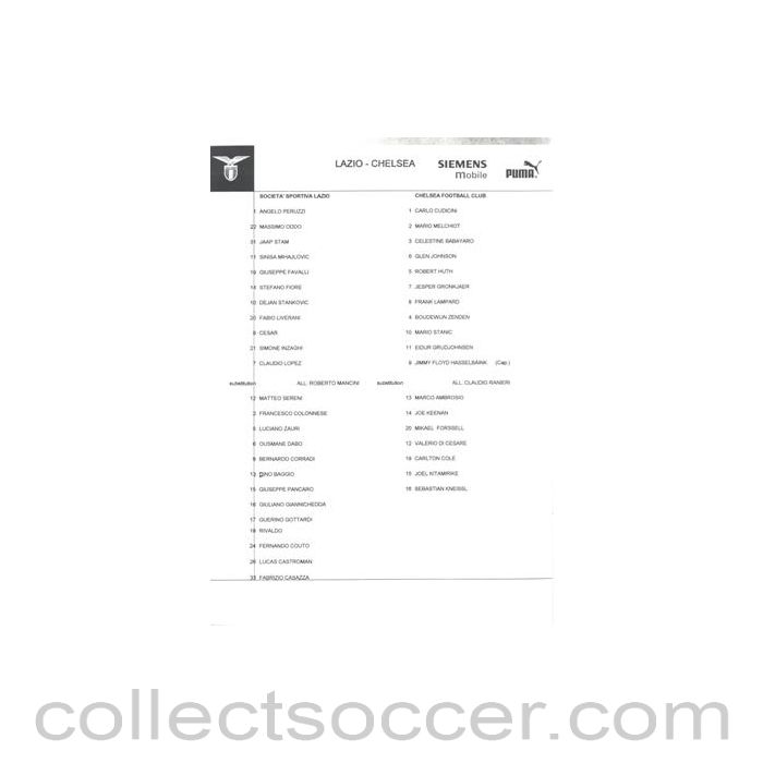 Lazio v Chelsea official teamsheet 04/11/2003, one page, in mint condition.