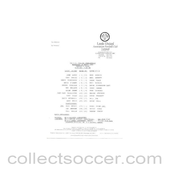 Leeds United v Aston Villa official teamsheet 16/03/1994 in very good condition.