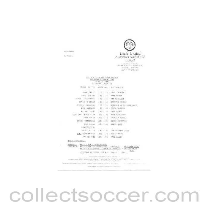 Leeds United v Southampton official teamsheet 05/03/1994 in very good condition.