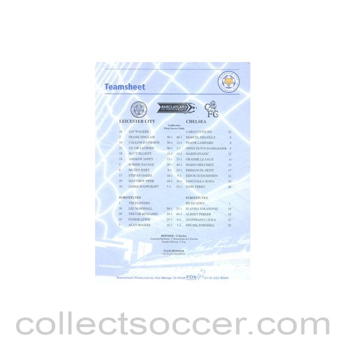 Leicester City v Chelsea official colour teamsheet, unknown season, Premier League, in very good condition.