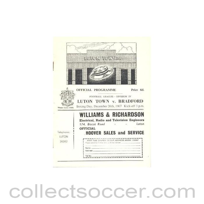 Luton Town v Bradford official programme 26/12/1967 in very good condition.