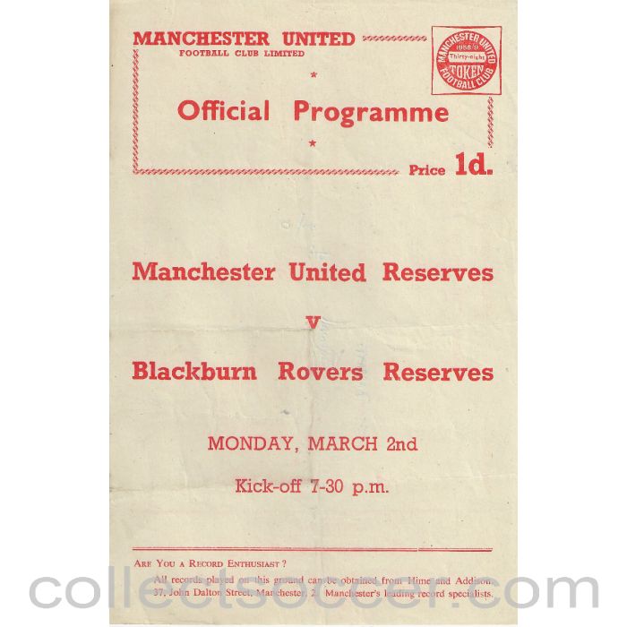 1959 - Manchester United Reserves v Blackburn Rovers Reserves 2/3/1959 Official Football Programme