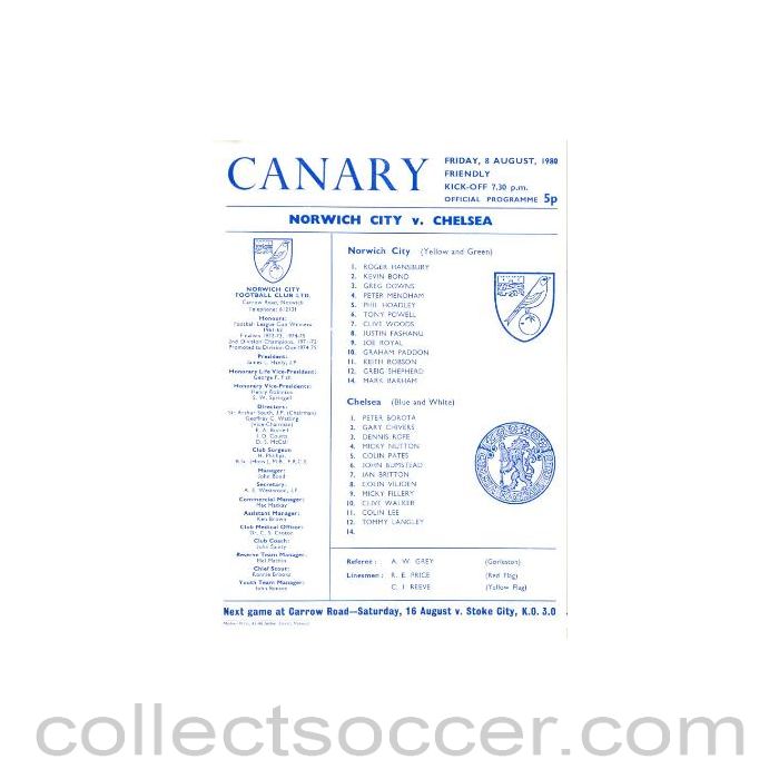 Norwich City vChelsea official programme 08/08/1980, 2 pages, in mint condition.