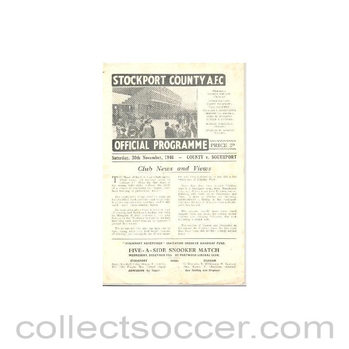 Stockport County v Southport official programme 30/11/1946, 4 pages, in very good condition.