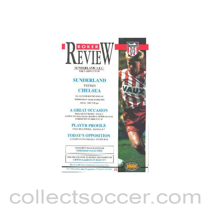 Sunderland vChelsea official programme 18/03/1992 F.A. Cup, 6th round, replay, 32 pages in mint condition.