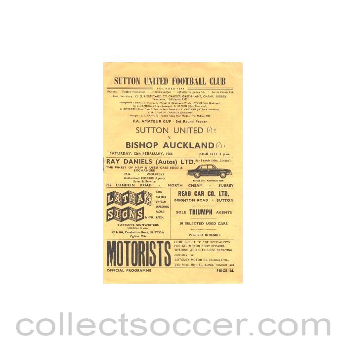 Sutton United v Bishop Auckland official programme 12/02/1966, in very good condition.