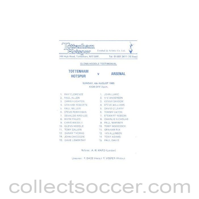 Tottenham Hotspur v Arsenal official programme 04/08/1985 Glenn Hoddle Testimonial Match, 1 page, in mint condition.