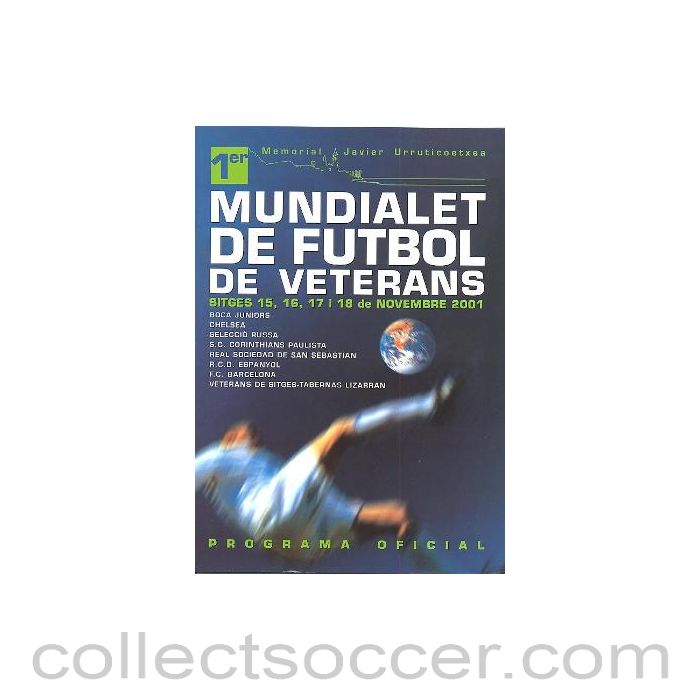 Veterans World Championship in November 2001 official programme. Participating teams are: Boca Juniors,Chelsea, Russia, Corinthians Paulista, Real Sociedad de San Sebastian, Spain, Barcelona Veterans de Sitges-Tabernas Lizarran. There is also an unused ticket available in the Tickets >Chelsea Tickets section here below. 20 pages in mint condition.