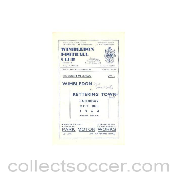Wimbledon v Kettering Town official programme 07/11/1964, in very good condition, score and team changes in pen.
