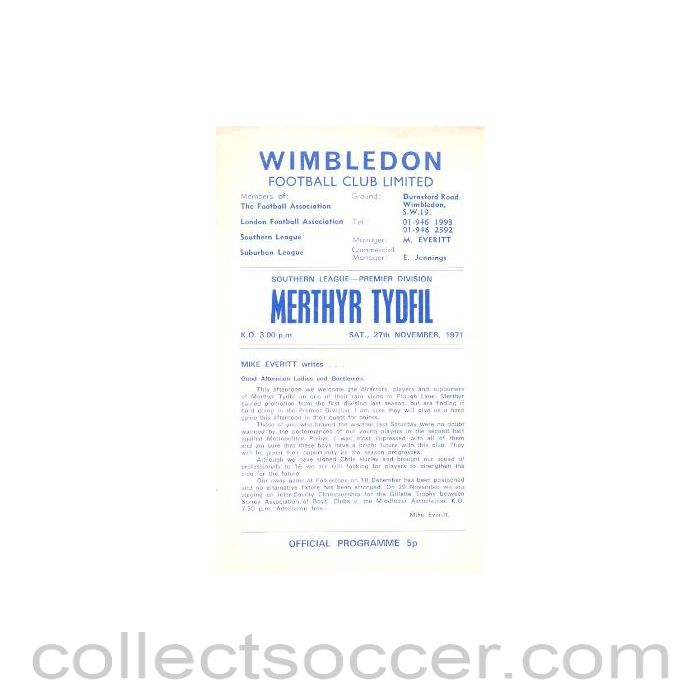 Wimbledon v Merthyr Tydfil official programme 27/11/1971, in very good condition, score and team changes in pen.