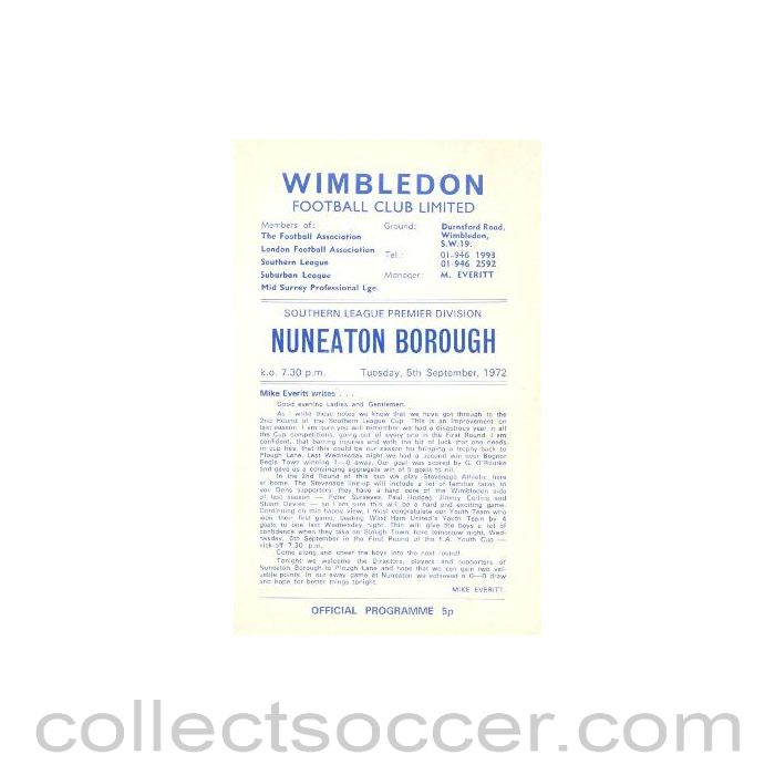 Wimbledon v Nuneaton Borough official programme 05/09//1972, in very good condition.