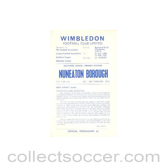 1972 - Wimbledon v Nuneaton Borough official programme 19/02/1972
