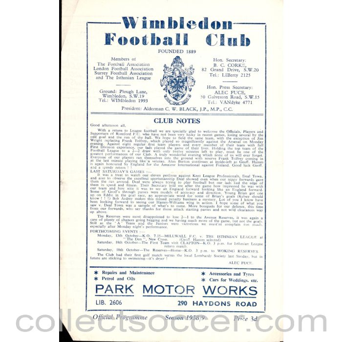 Official Programme for the match at Plough Lane played between Wimbledon and Romford on the 11th October 1958.