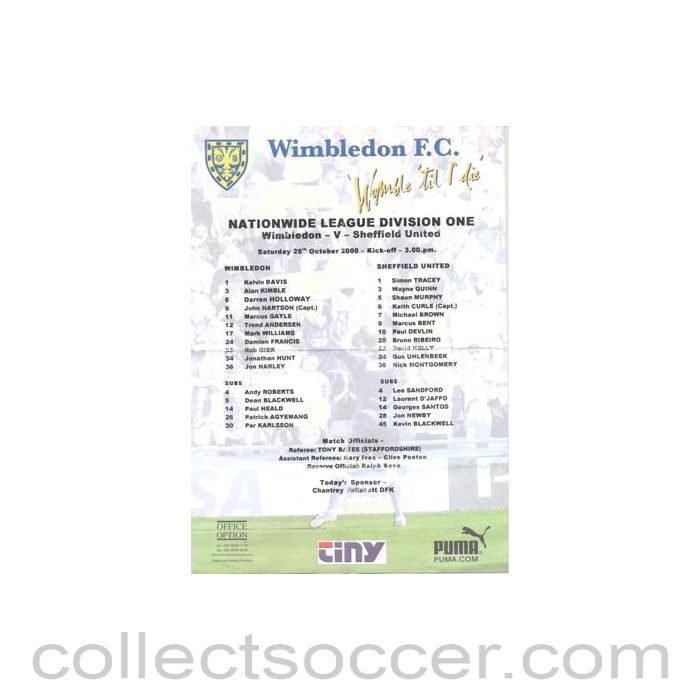 2000 - Wimbledon v Sheffield United official colour teamsheet 28/10/2000 Football League