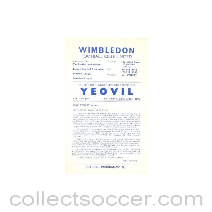 Wimbledon v Yeovil Town official programme 22/04/1972, in very good condition.